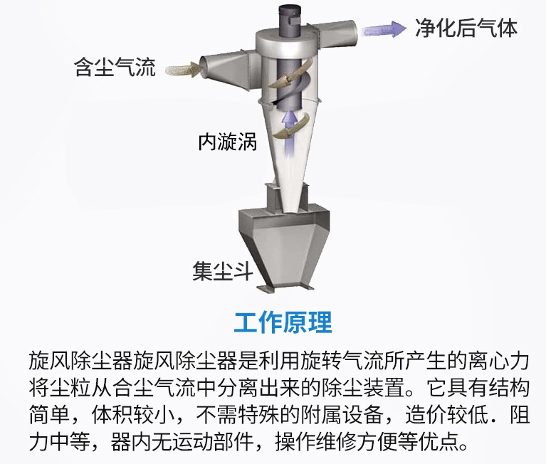 该除尘器为旋风类除尘器,当含尘气体进入除尘器,通过陶瓷导向器,在旋风子内部高速旋转,在离心力的作用下,粉尘和气体分离,粉尘降落在集尘箱内,经放灰阀排出,净化的气体形成上升的旋流,通过排气管汇于集气室,经出口由烟囱排出,达到除尘效果。